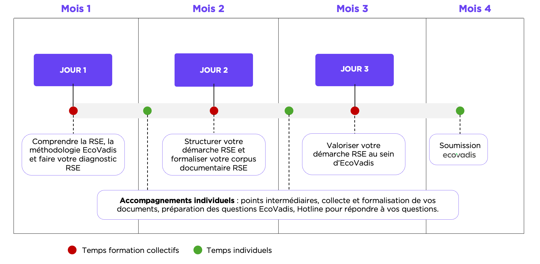 - 3 jours de formation collective pour maîtriser les enjeux de la RSE, la méthodologie EcoVadis et pour initier la structuration de votre système de management RSE.